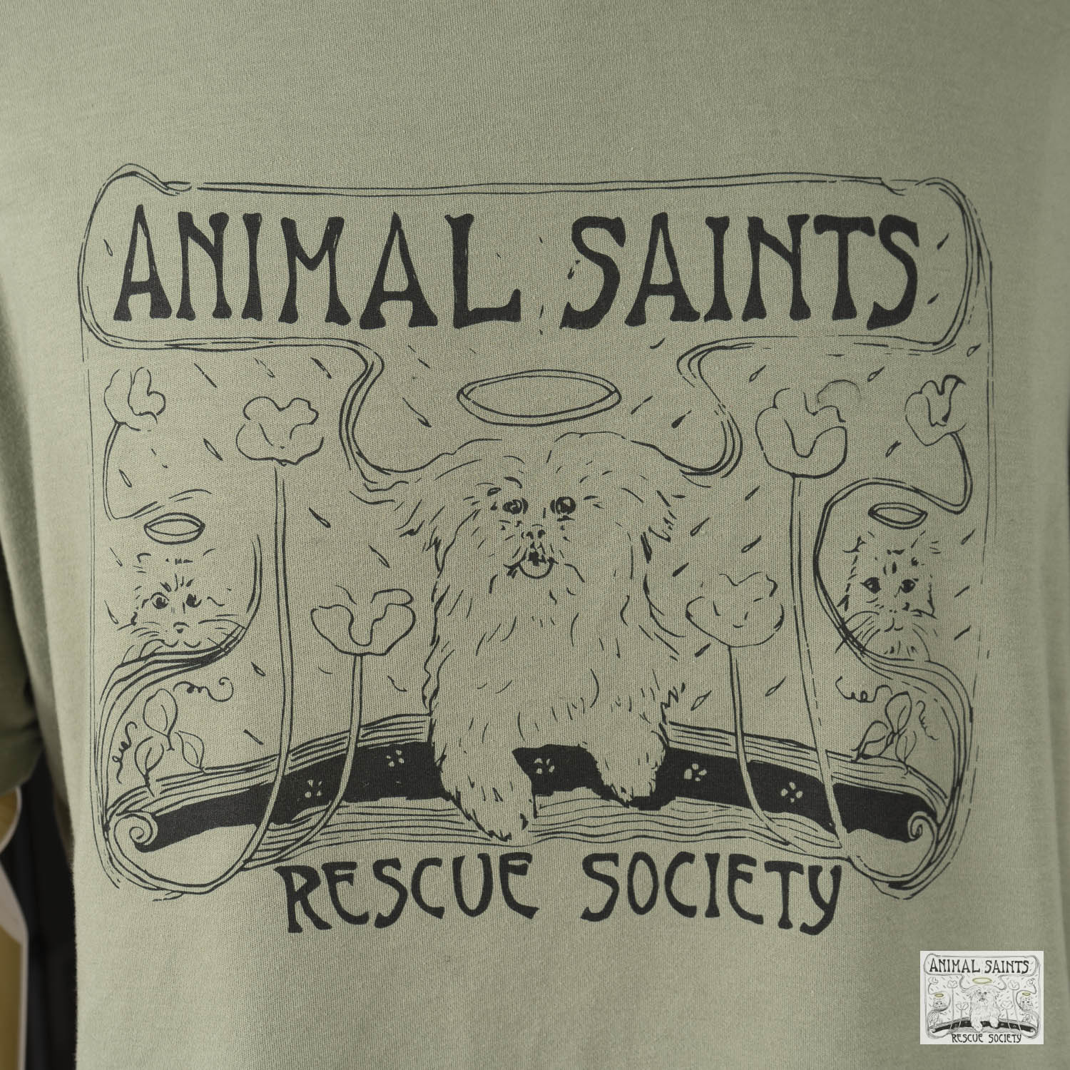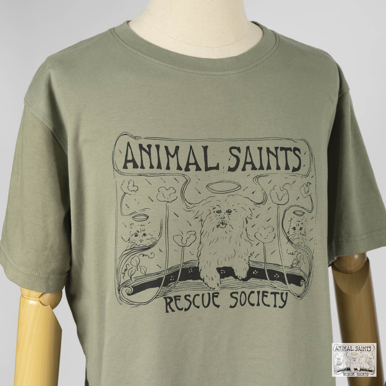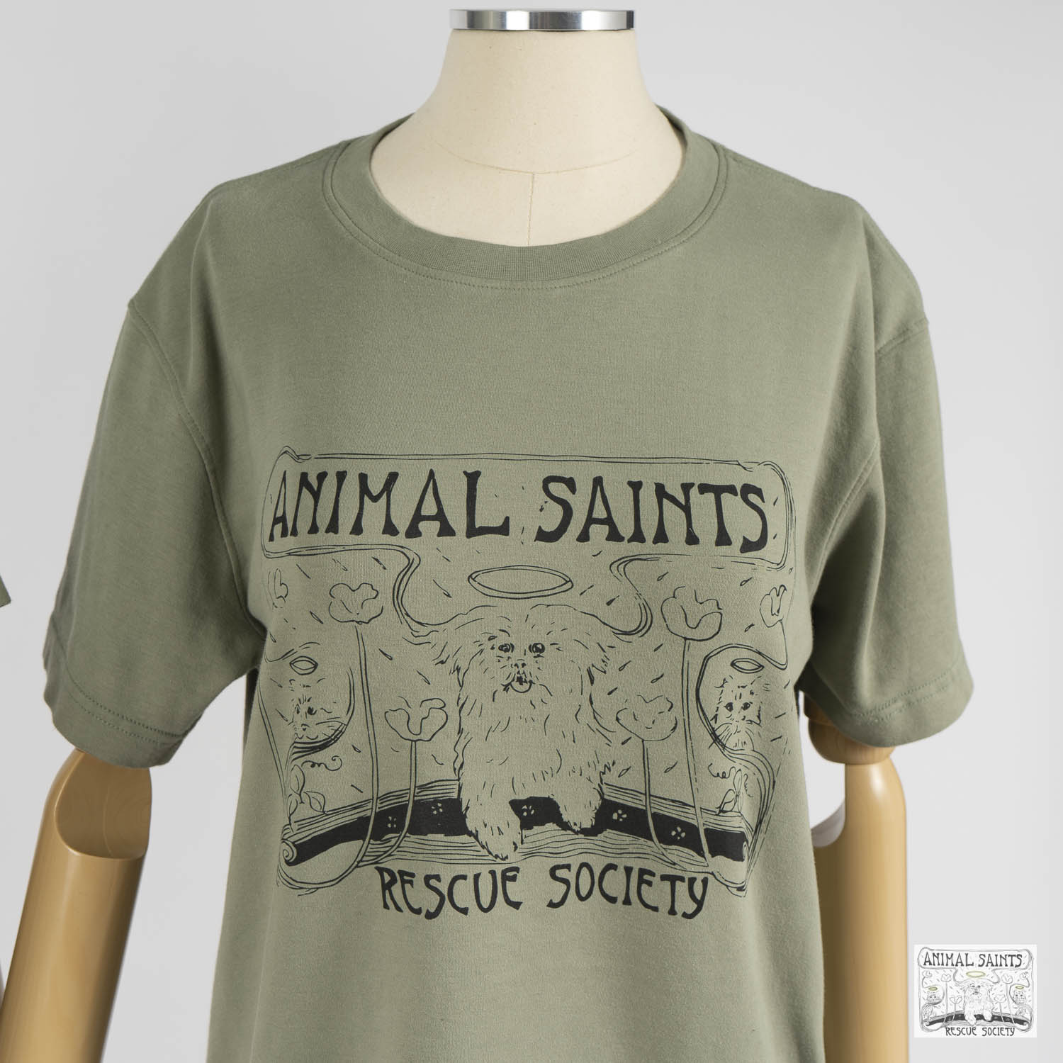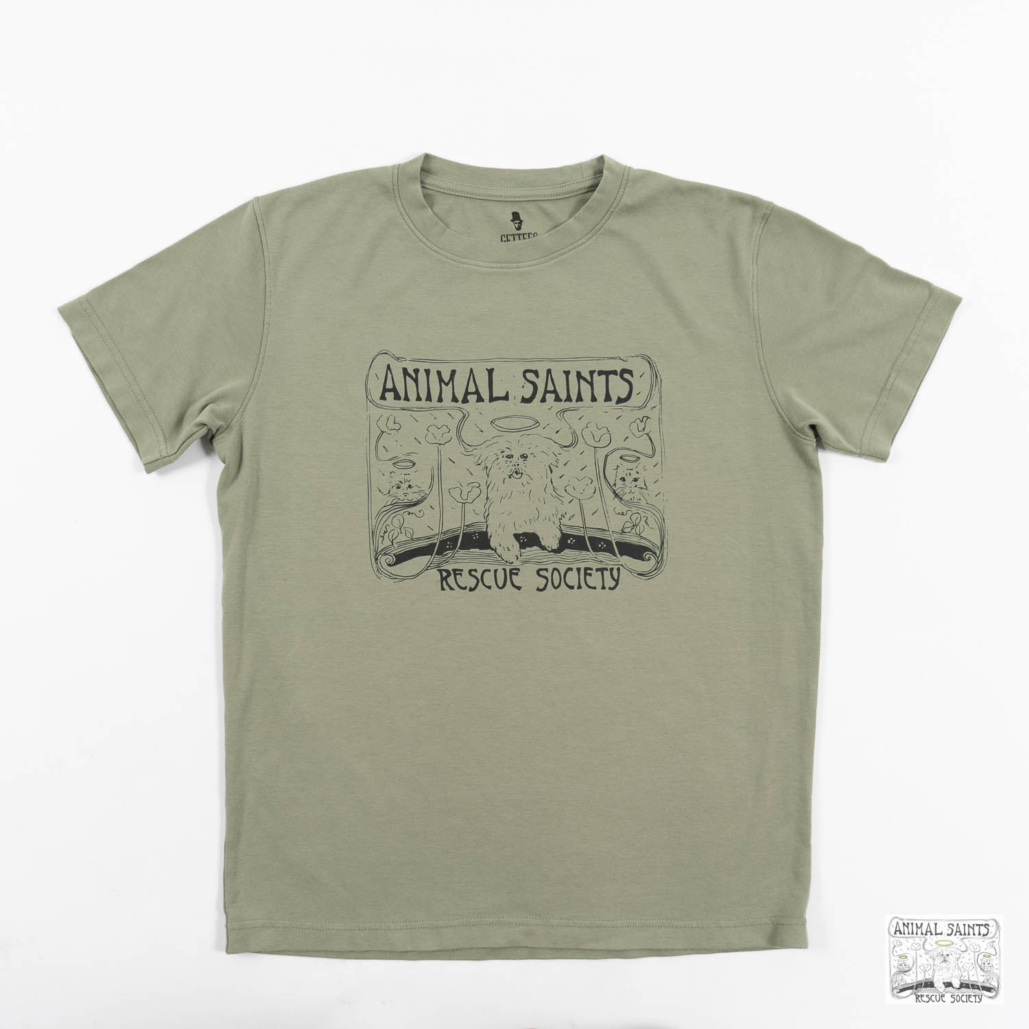 Human grade t-shirt in a soft green hue with the inspirational Animal Saints logo.
