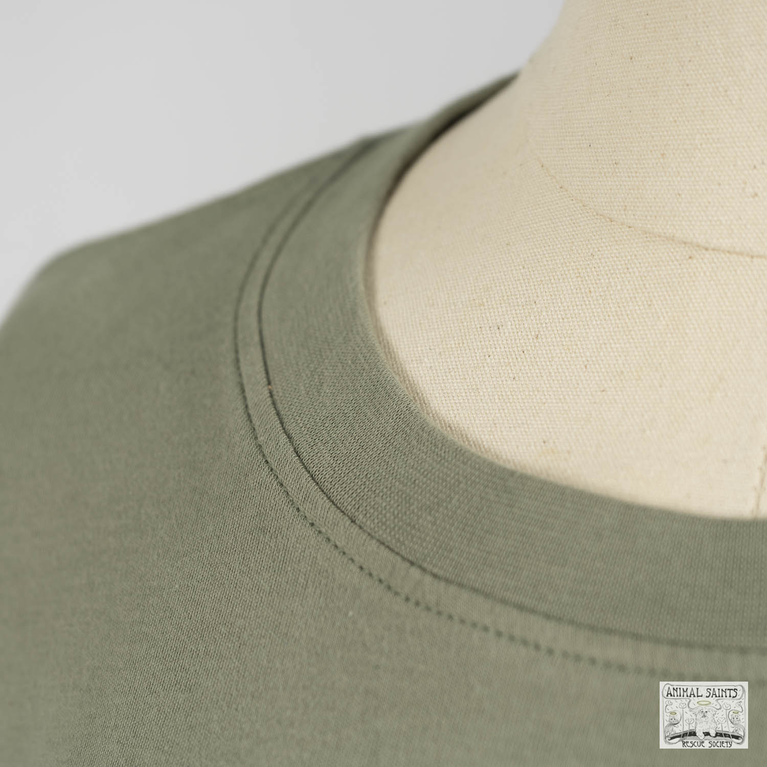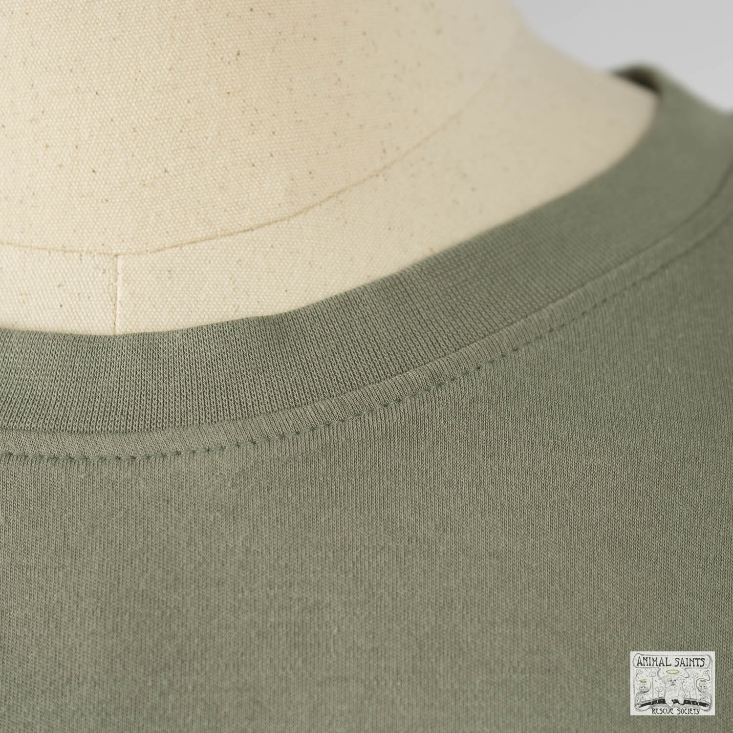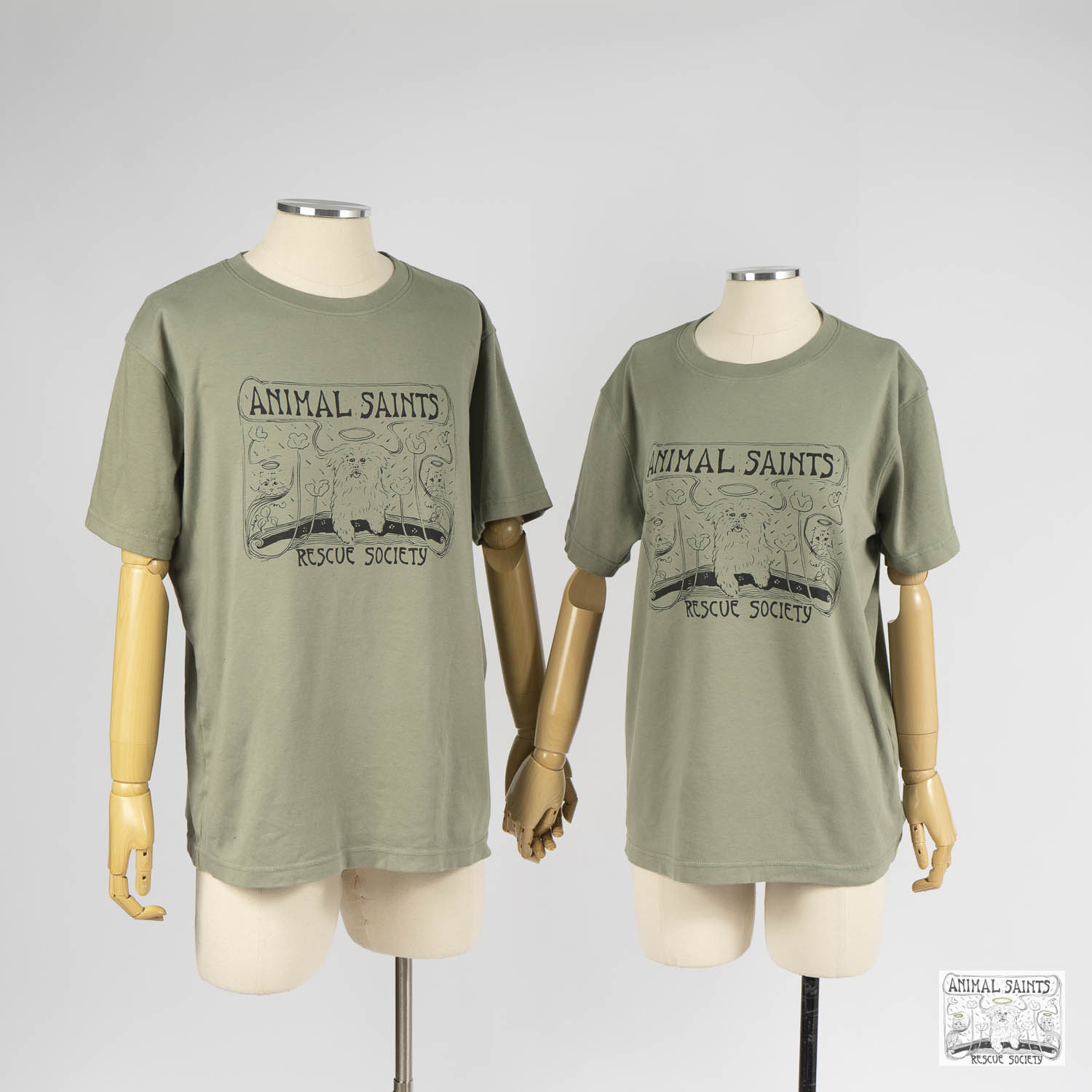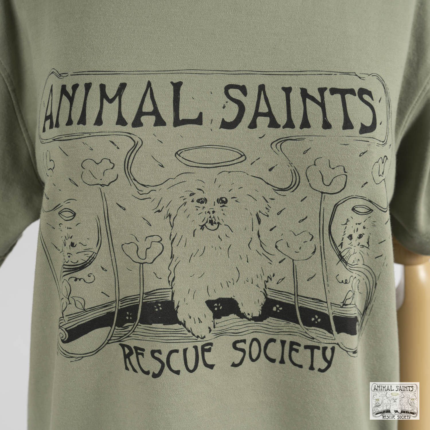 Human grade t-shirt in a soft green hue with the inspirational Animal Saints logo.